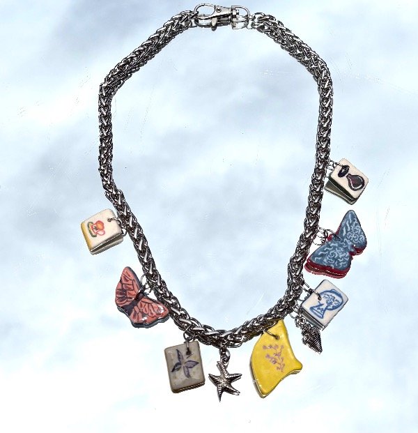 Cadena de acero quirúrgico, con dijes de acero y de cerámica pintados a mano